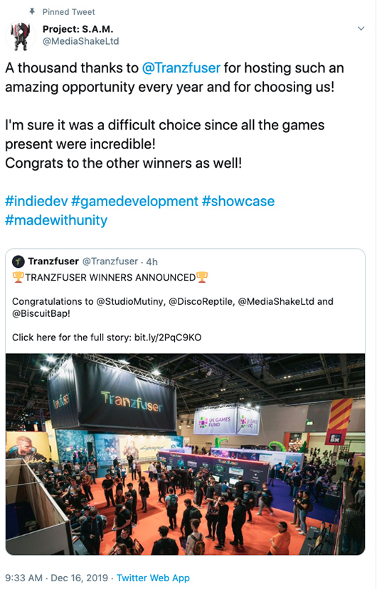 “A thousand thanks to Tranzfuser for hosting such an amazing opportunity every year and for choosing us! I'm sure it was a difficult choice since all the games present were incredible. Congrats to the other winners as well,” the Project: S.A.M announced on Twitter.